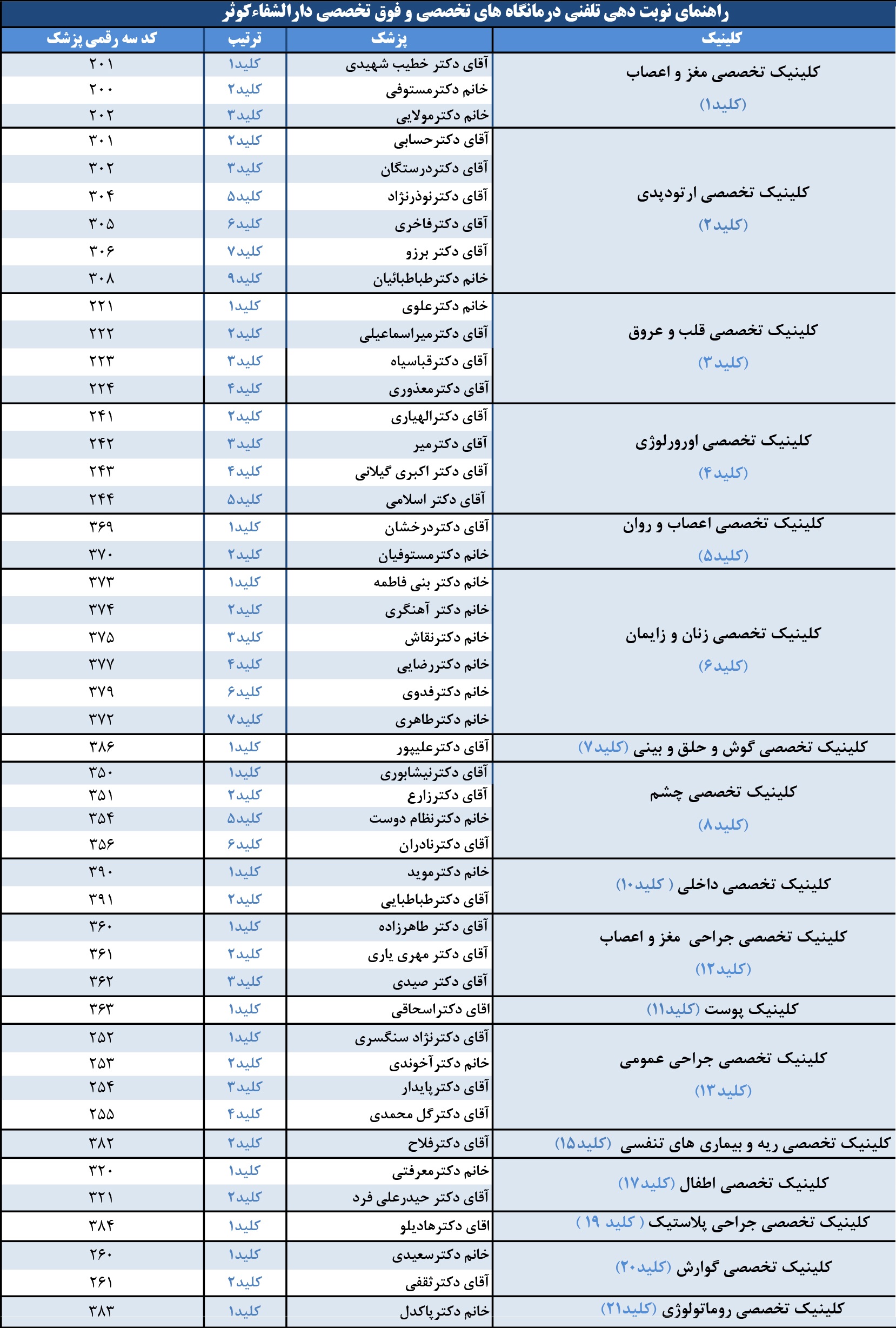 - كلينيك مورد نظر خود را مطابق با اعلام پيغام صوتي و طبق جدول پيش رو انتخاب نماييد